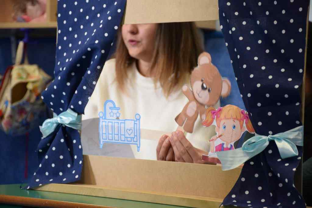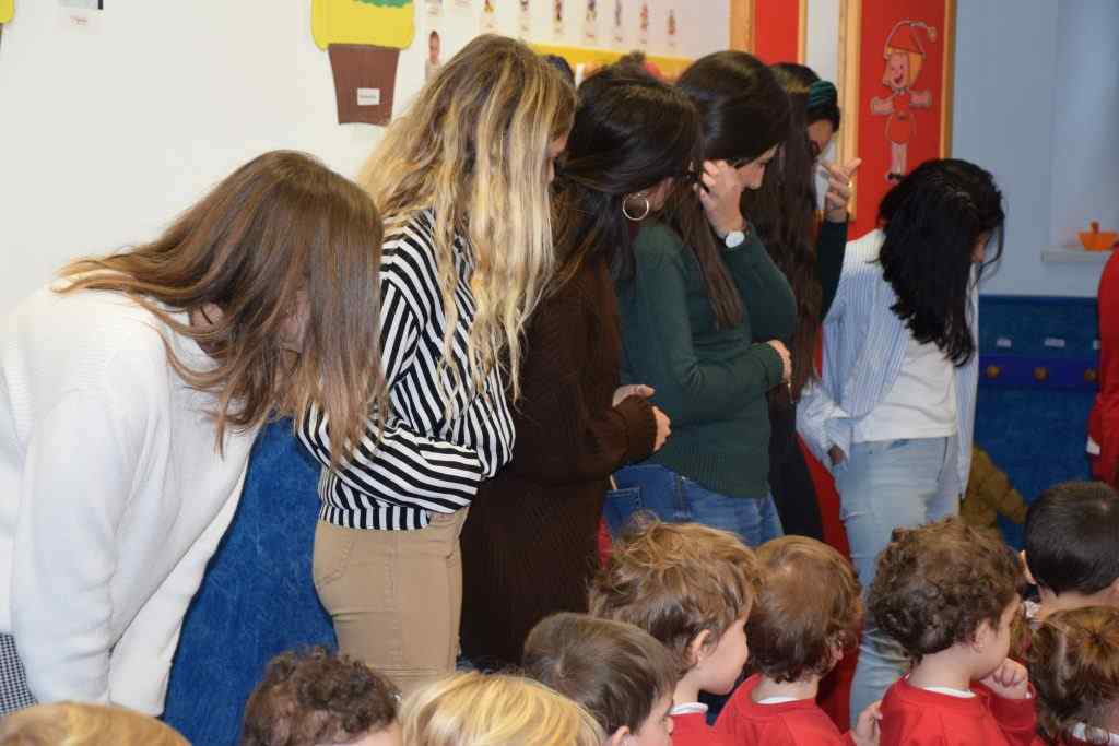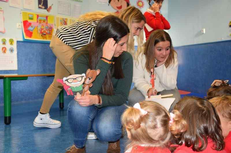 Guiñol, marionetas, todo preparado con mucha ilusión para su puesta en escena. Tres alumnas prepararon, durante la semana pasada, este cuento de Navidad. Para contarlo han empleado técnicas didácticas aprendidas en clase según el desarrollo cognitivo de los niños a los que se iban a dirigir: 2 años. Los pequeños alumnos «en prácticas» escuchaban impertérritos el relato, mientras ellas lo representaban con las marionetas detrás de un guiñol fabricado especialmente para la ocasión. ¡No sabemos quién ha disfrutado más, los niños o ellas!.