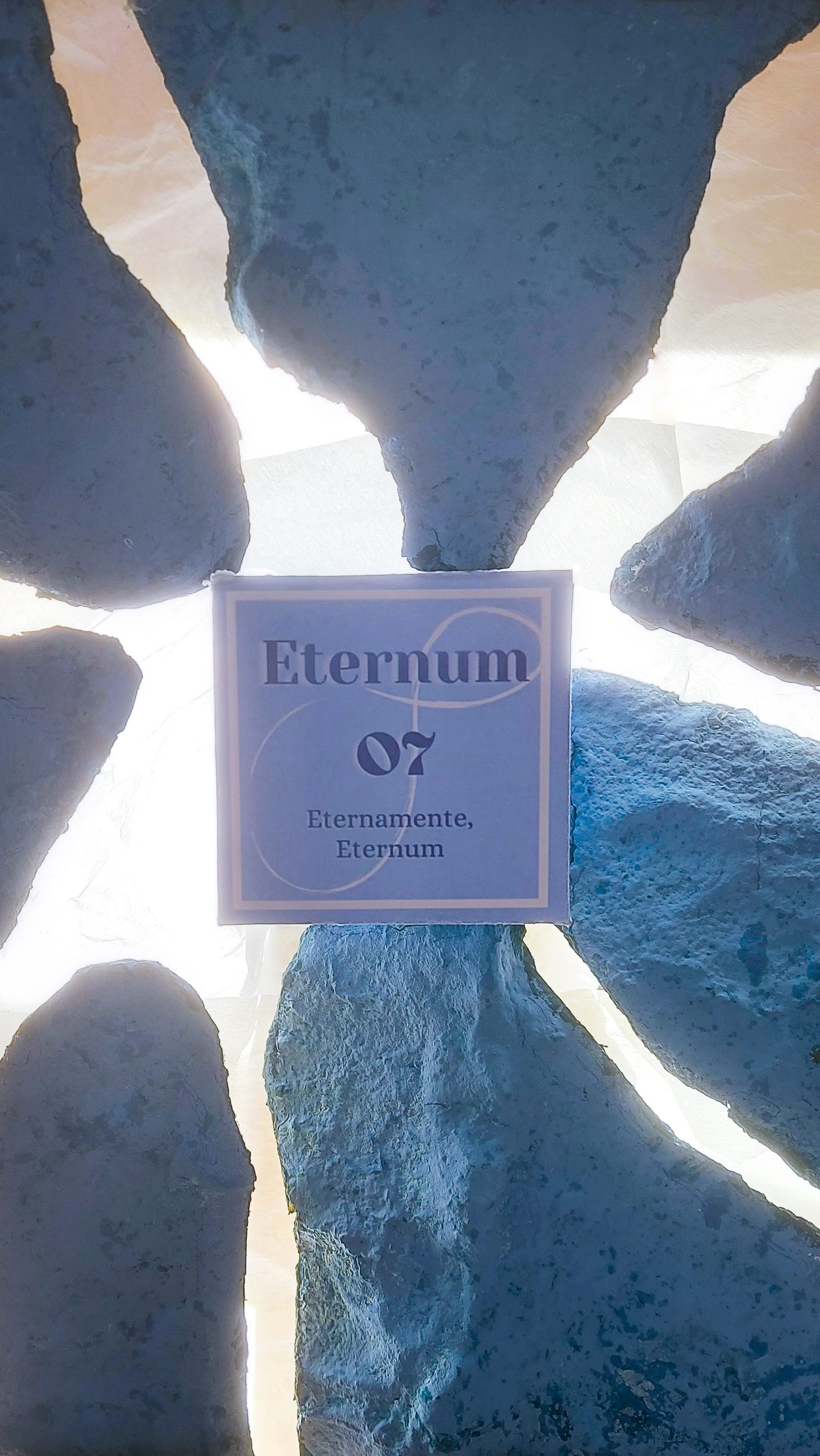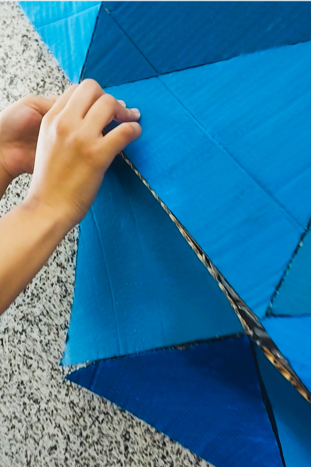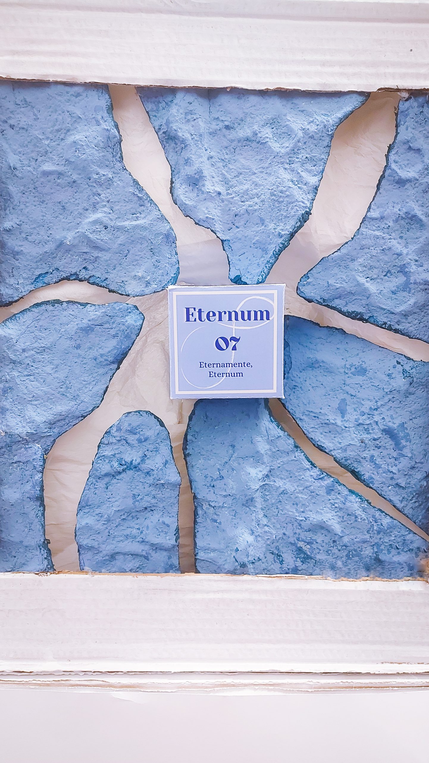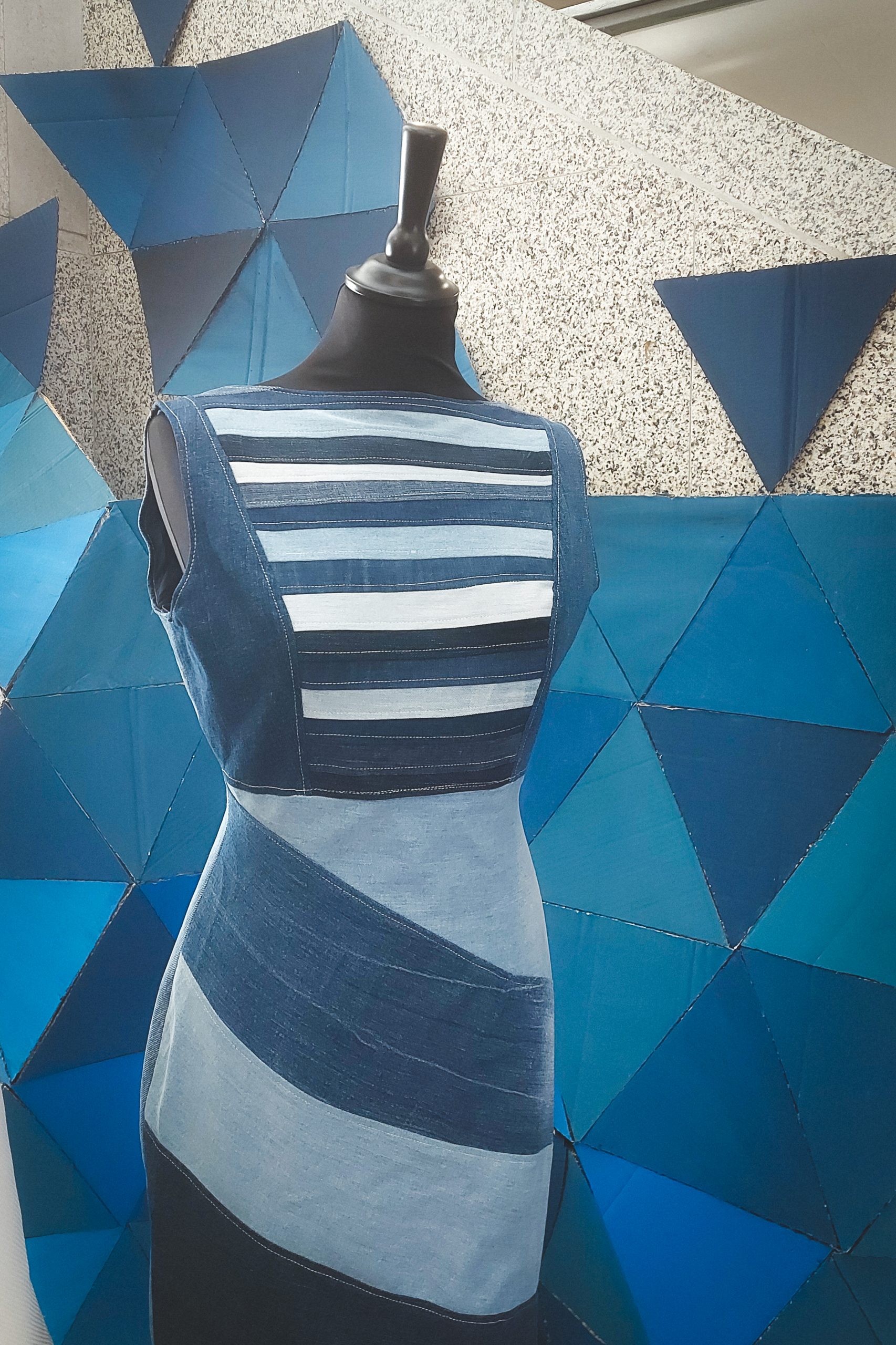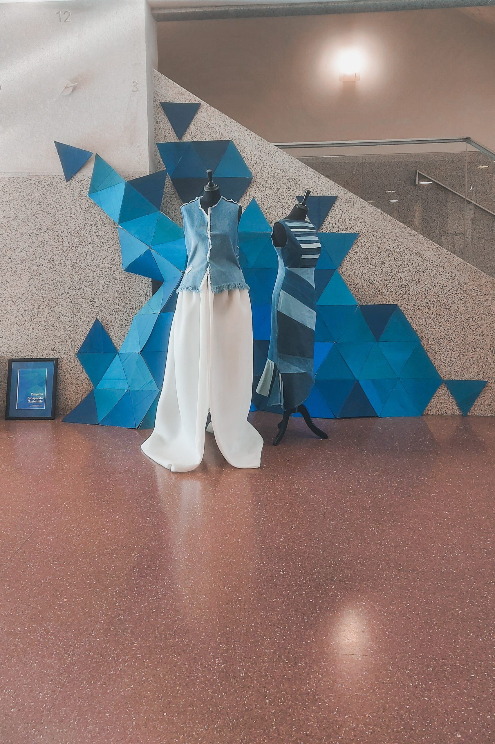 Siguiendo esa misma intención y apoyándonos en el uso del azul en varias tonalidades y usando cartón recuperado de embalajes para reciclar, hemos creado un espacio expositivo lleno de dinamismo y color. La composición se basa en una estructura abstracta desarrollada a través de triángulos equiláteros que permiten una estructura fluida, resistente y versátil, que se adapta perfectamente al espacio. El color azul nos recuerda al agua del océano que lucha por sobrevivir a los desajustes provocados también por la contaminación. En resumen, nuestro diseño apoya la sostenibilidad como medio creativo, reivindicando la lucha por proteger el medioambiente y nuestro planeta azul.