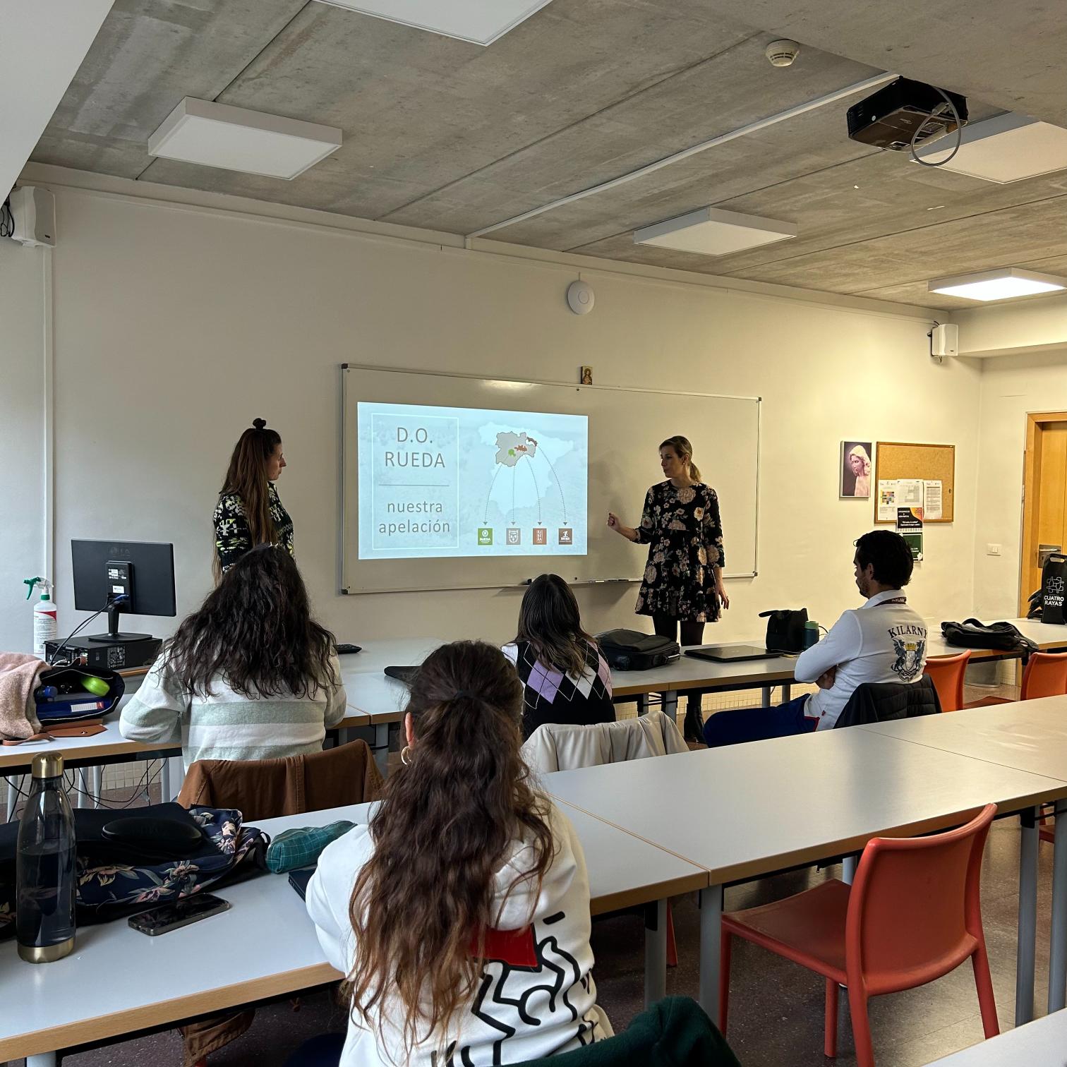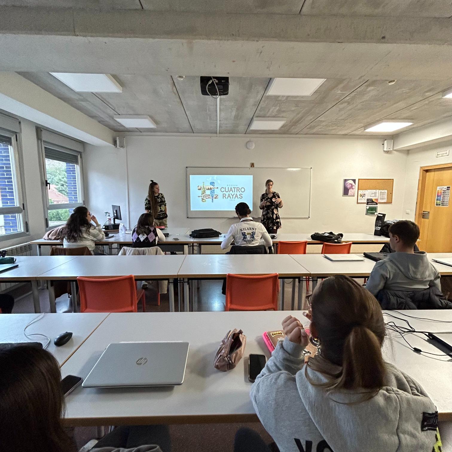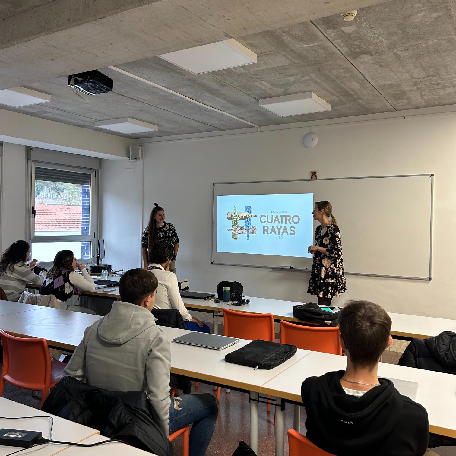 Sara y Clara, trabajadoras del departamento de Comunicación y Diseño de la Bodega Cuatro Rayas, han venido a visitarnos a la Escuela después de habernos conocido en la visita que realizamos a sus instalaciones a principios de octubre.