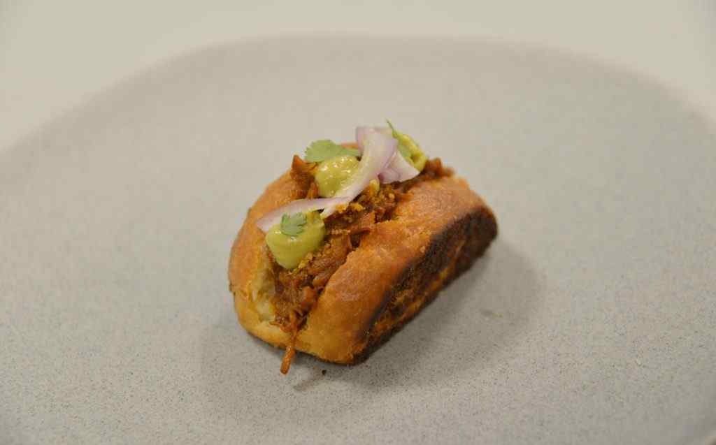 «Brioche de cochinilla», de Alfonso. ¡El ganador del concurso de tapas de este año!. Nuestro alumno ha apostado por un brioche marcado con un relleno muy potente.