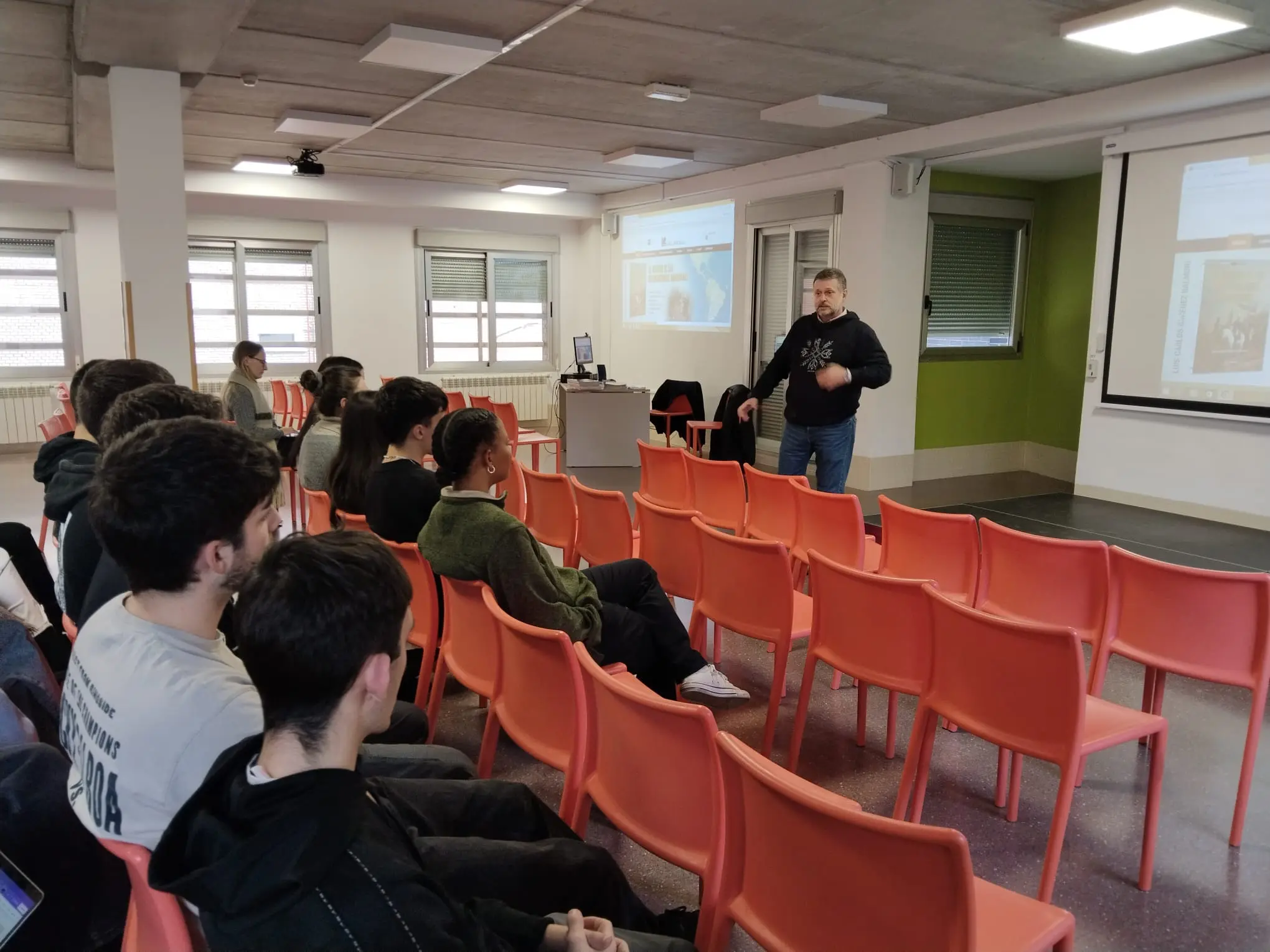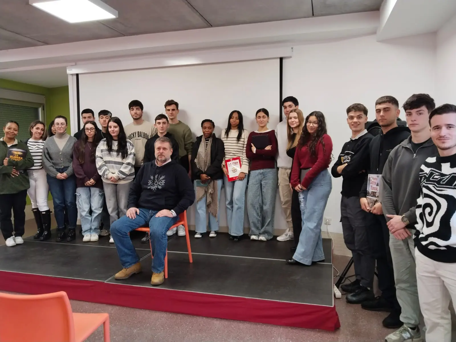 Su generosidad a la hora de compartir conocimiento y su manera amena de contar los entresijos de su actividad ha despertado el interés de los alumnos quienes, además de debatir sobre la mejor manera de llegar al público objetivo, han podido llevarse una muestra de su trabajo (varios ejemplares de la revista de historia Ares, La risa que llevas puesta, una antología de humor gráfico de J.M. Nieto y otros volúmenes, alguno de ellos escrito por el propio editor como Viento del Norte).