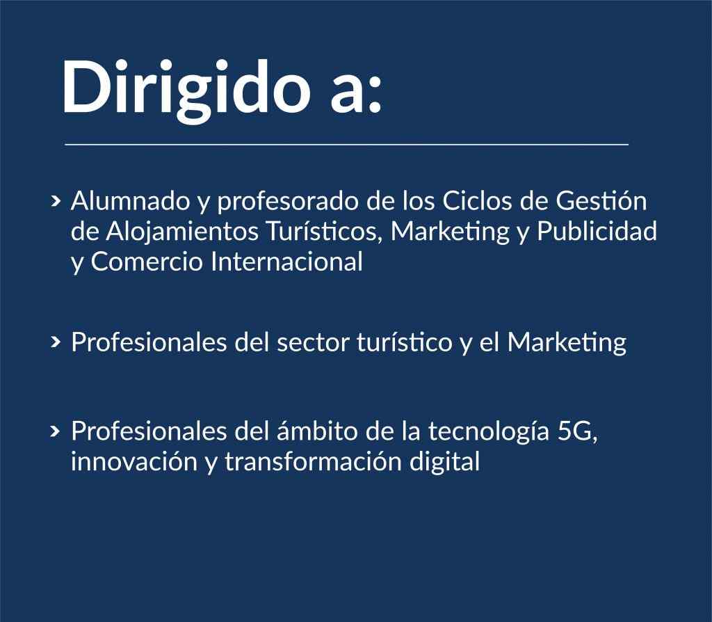 En el marco del Proyecto de Innovación: «Oportunidades de la Comunicación 5G para Alojamientos Turísticos«, el objetivo de este Foro es identificar los nuevos perfiles de «profesionales digitales» del sector turístico y desarrollar las competencias profesionales vinculadas a la digitalización.