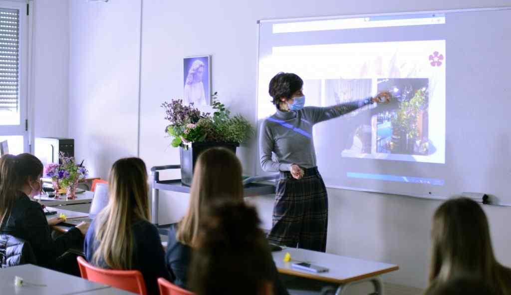 Virginia, de La Jara, realizó una presentación con ejemplos muy ilustrativos sobre la decoración floral en tiendas, escaparates, terrazas, eventos, etc. Además, trajo muchas flores frescas para hacer un ramo y un centro de flores y que nuestros alumnos pudieran ver en directo su trabajo.
