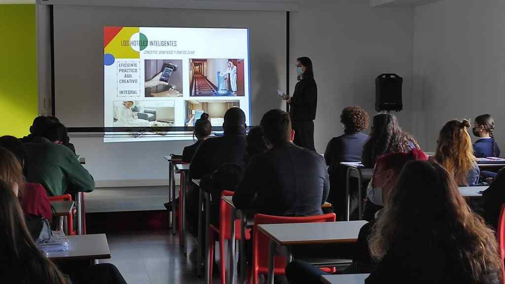 Durante las dos horas compartidas, Cristina Coca, actual alumna de Marketing y antigua alumna de Gestión, ha expuesto su trabajo final sobre hoteles inteligentes. Esto ha sido una primera toma de contacto con la tecnología 5G, Internet de las cosas y la amplia gama de posibilidades que da la innovación a la mejora del turismo.